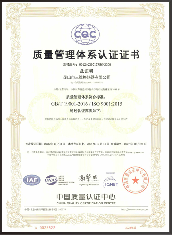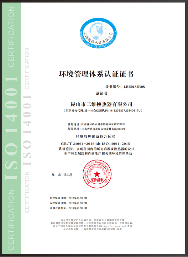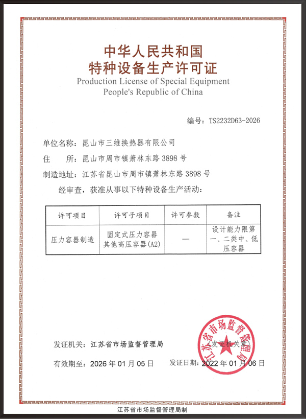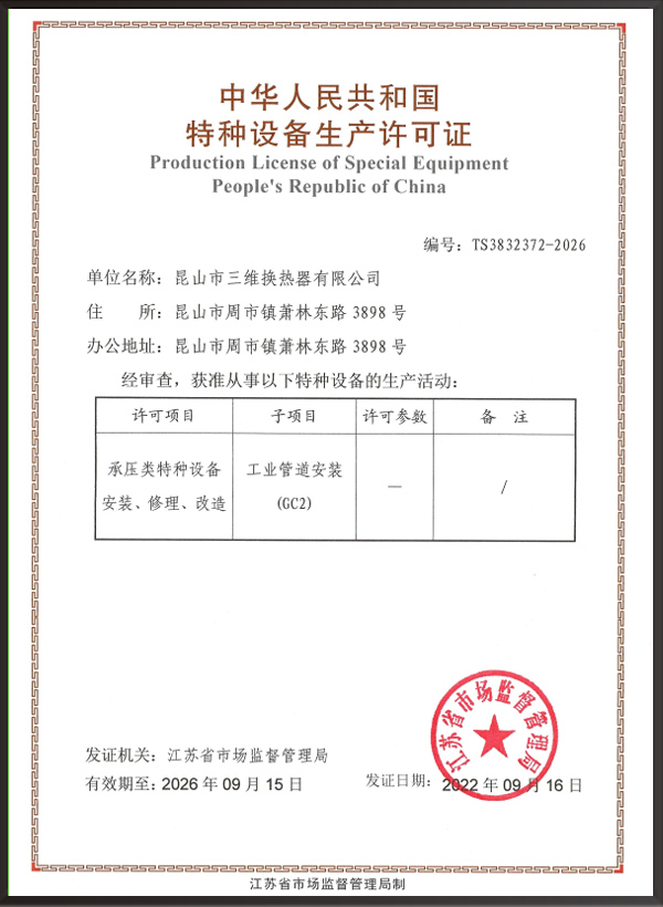 昆山市三維換熱器有限公司注冊資本5000萬元,資產(chǎn)2.1億元,公司地址位于江蘇省昆山市周市鎮(zhèn)蕭林東路3898號,法人代表為顧安生,公司設(shè)有技術(shù)部、生產(chǎn)部、檢驗部。